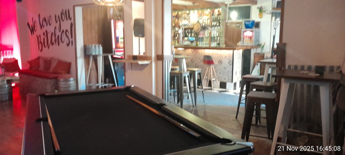 Well stocked bar area, offering local draught beers, full range of spirits & Bottled beers. A 90 Mt area with plenty of seating, and a cosy area & a full size pool table plus games on the gaming machine, Darts board .